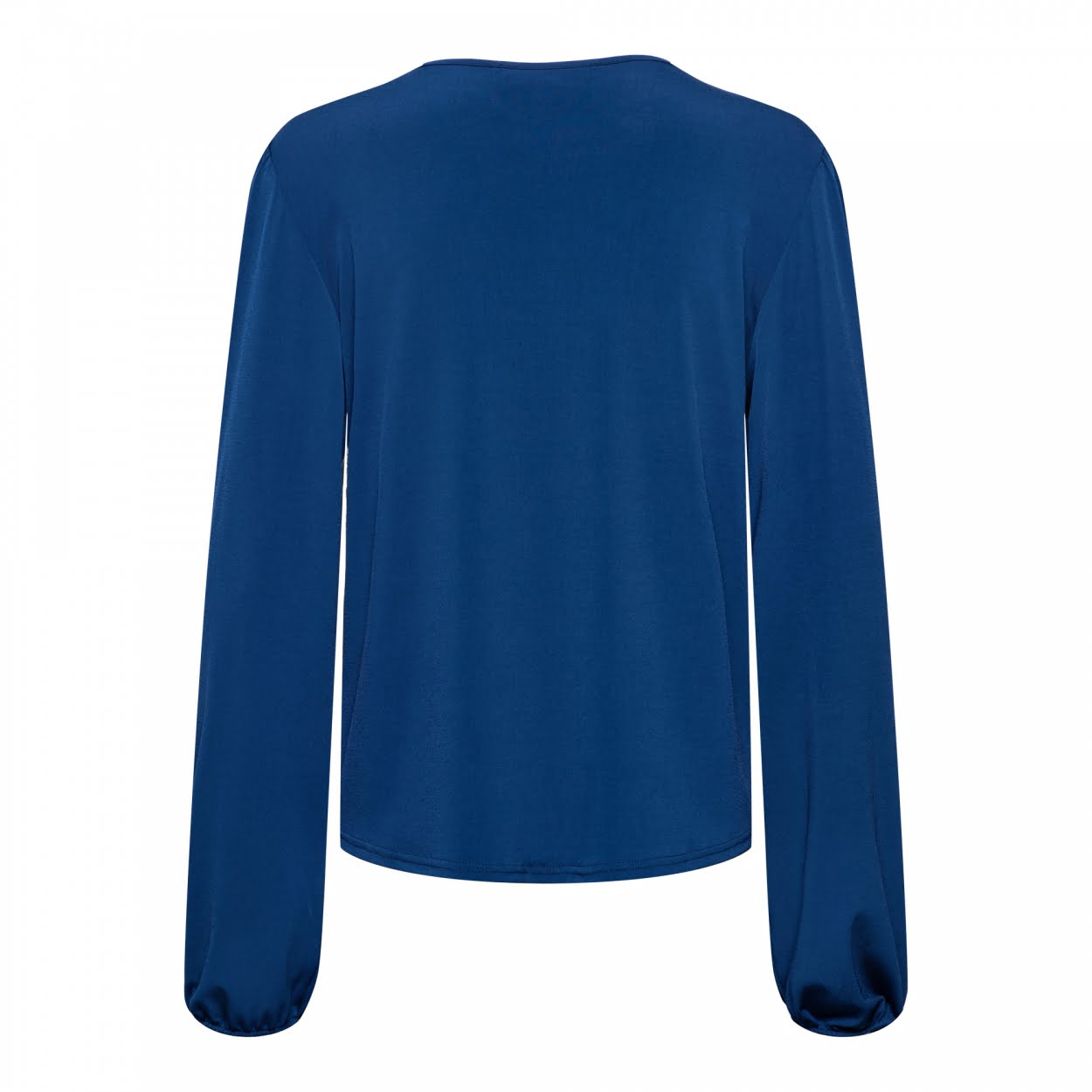 Soepel vallende top van AndCo Woman in een prachtige diepblauwe kleur. Ronde hals met strikdetail en lange los vallende mouwen die zijn afgewerkt met een elastiekzoom.